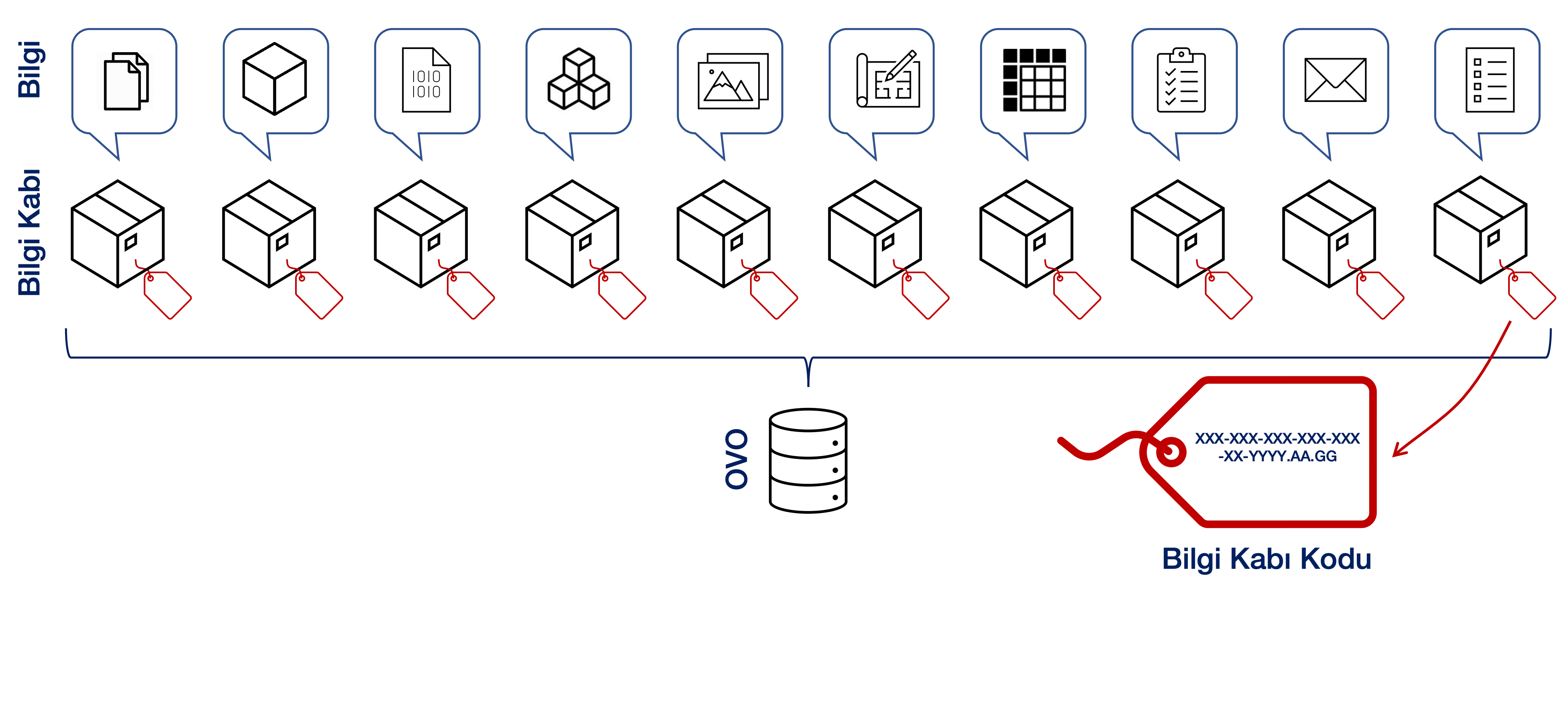 Teslim gereksinimleri için üretilen bilgiler: bir bilgi modeli veya belge olsun, projede paylaşımın yapıldığı ortak veri ortamına içerdiği bilgiyi etiketleyen, benzersiz kimliğini ifade eden bir bilgi kabı aracılığıyla paylaşılacaktır. Bilgi kabı bir maliyet planı, bir program, bir çizim, bir geometrik bilgi modeli vb. olabilir. Her bilgi kabının belgelendirilmiş bir kurala dayanan, tutarlı ve benzersiz bir kimliğe sahip olması gerekmektedir. Aşağıdaki görsel temsili olarak bilgi, bilgi kabı ve kodlamaları göstermektedir.